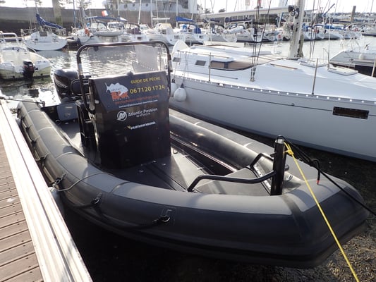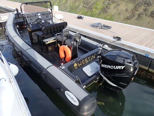 Le bateau est très spacieux, longueur de 7,30 m, motorisé d'un moteur de 250 chevaux de dernière génération (Mercury Seapro V8). L'ensemble offre un maximum de confort à bord et